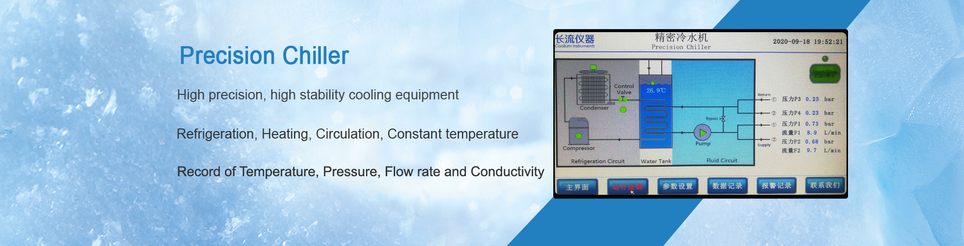 In the application of precision chillers, flow monitoring is a very important part, sometimes its importance even exceeds temperature monitoring. For the precision chiller of long flow instrument, according to the requirements of users, multi parameter measurement and control system can be selected to measure and control the temperature, pressure, flow, conductivity and other parameters of cooling water, so as to meet the precision cooling requirements of users' equipment.